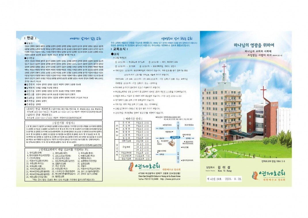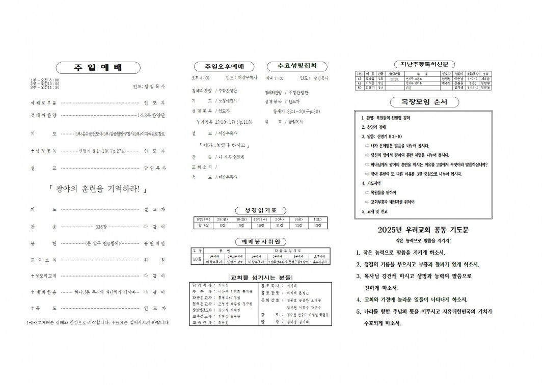 2025. 9. 28 주보 페이지 정보 작성자최고관리자 댓글 0건 조회 243회 작성일 25-09-26 21:23 본문 . 첨부파일 20250928.pdf (331.7K) 4회 다운로드 | DATE : 2025-09-26 21:23:24 목록 이전글2025. 10. 5 주보 25.10.02 다음글2025. 9. 21 주보 25.09.19 댓글목록 댓글목록 등록된 댓글이 없습니다.