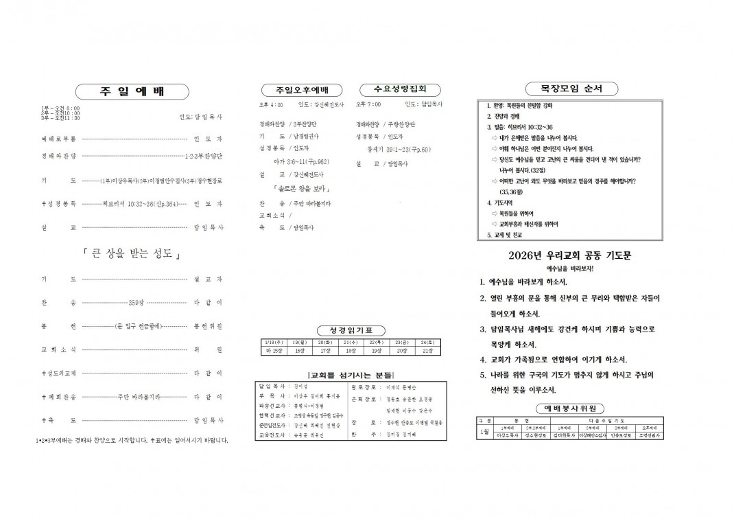 2026. 1. 18 주보 페이지 정보 작성자최고관리자 댓글 0건 조회 186회 작성일 26-01-16 21:00 본문 . 첨부파일 20260118.pdf (331.5K) 3회 다운로드 | DATE : 2026-01-16 21:00:40 목록 이전글2026. 1. 25 주보 26.01.23 다음글2026. 1. 11 주보 26.01.09 댓글목록 댓글목록 등록된 댓글이 없습니다.