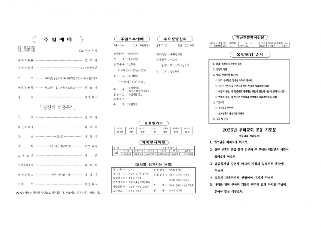 2026. 2. 8 주보 페이지 정보 작성자최고관리자 댓글 0건 조회 188회 작성일 26-02-06 19:49 본문 . 첨부파일 20260208.pdf (338.8K) 4회 다운로드 | DATE : 2026-02-06 19:49:37 목록 이전글2026. 2. 15 주보 26.02.13 다음글2026. 2. 1 주보 26.01.30 댓글목록 댓글목록 등록된 댓글이 없습니다.