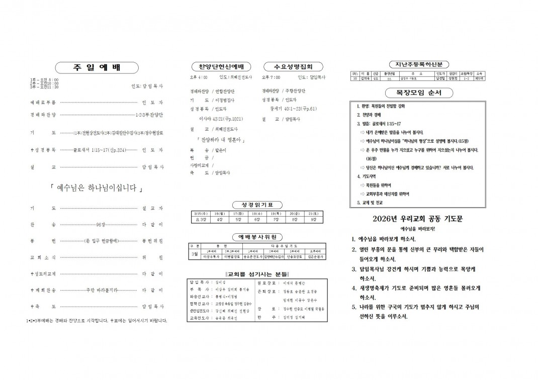 2026. 3. 15 주보 페이지 정보 작성자최고관리자 댓글 0건 조회 196회 작성일 26-03-13 19:32 본문 . 첨부파일 20260315.pdf (338.3K) 4회 다운로드 | DATE : 2026-03-13 19:32:45 목록 이전글2026. 3. 22 주보 26.03.20 다음글2026. 3. 8 주보 26.03.06 댓글목록 댓글목록 등록된 댓글이 없습니다.